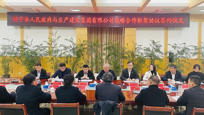 在签约仪式前举行的双方会谈中,严介和理事长表示,集团将紧跟国家发展战略趋势,高效参与怀宁基础设施投资建设,助力怀宁基建发展,在怀宁发展高端现代服务业,助推怀宁乡村振兴。争做“一流的商人:先要脸后要钱”,以主人翁的心态当好怀宁的“金牌运动员”。将世界500强的“资源、智慧、资本”多元化地与怀宁相结合,落实企业区域总部入驻怀宁、迁入总承包一级资质,并将GDP和税收完全注入当地。“做人先做事”,企业既进了怀宁门,就做怀宁人、说怀宁话、办怀宁事、尽怀宁责,将好事做得更好,麻烦事做得尽善尽美。想,壮志凌云;做,脚踏实地。深入参与怀宁建设发展,与怀宁人民和政府风风雨雨、一路相随、不离不弃。