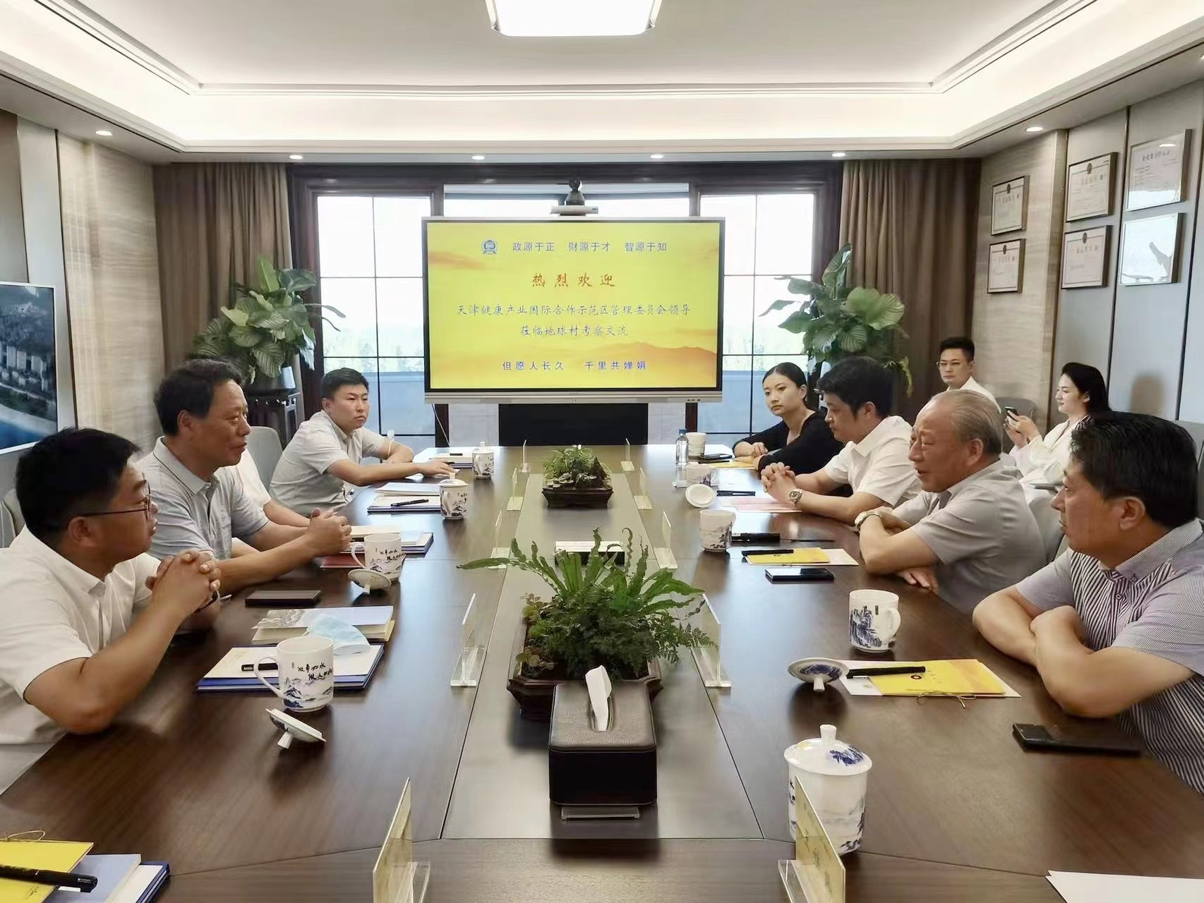 8月11日,严介和理事长在地球村会见天津健康产业国际合作示范区管委会二级巡视员朱奎元一行,双方就天津市静海区基础设施投资建设等合作事宜进行深入交流。京商建设董事局主席汪晓荣陪同。